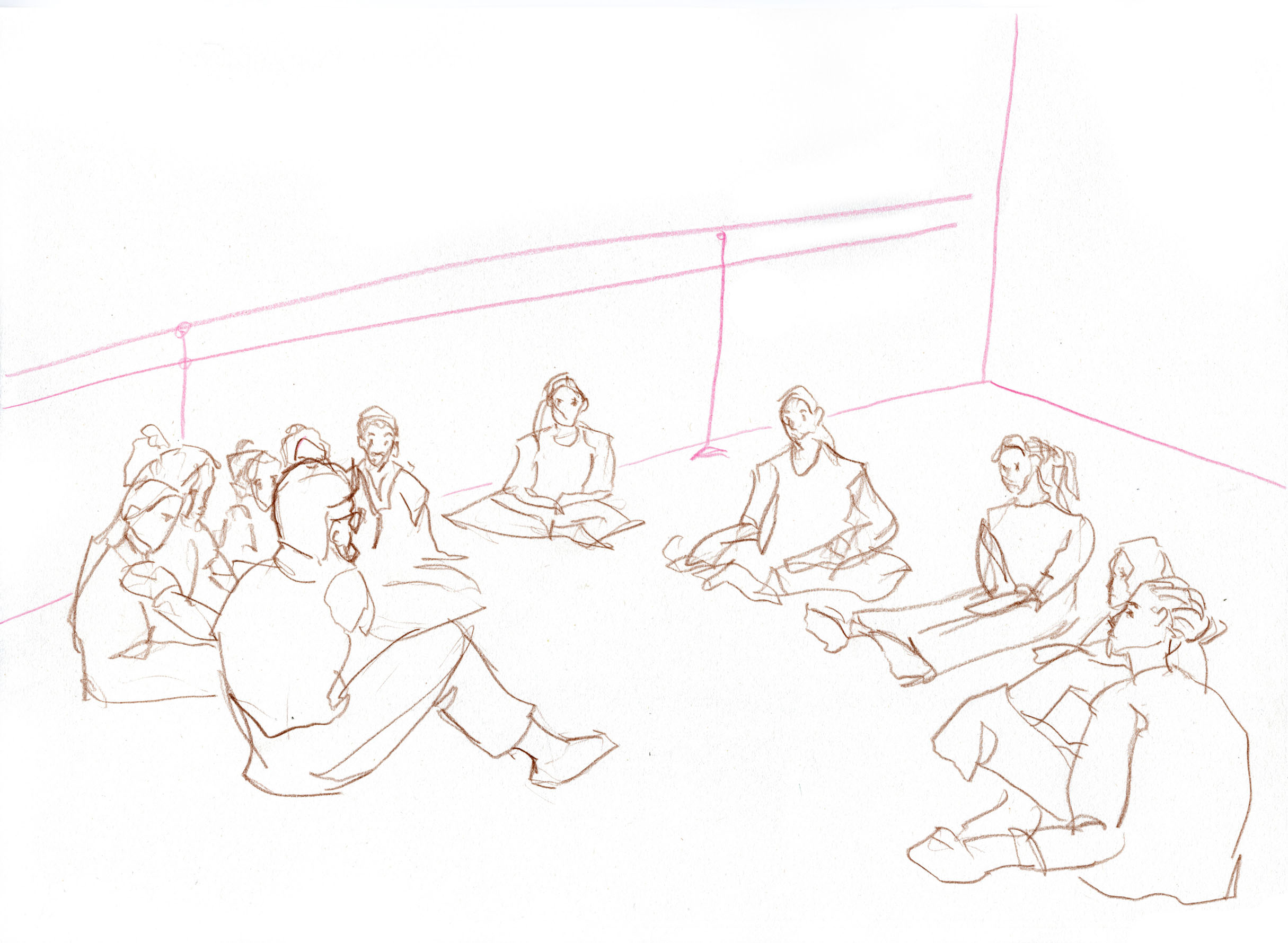Dieses Reportagezeichnungsprojekt ist aus einer Kollaboration mit der Tanzklasse von Jakub Truszkowski am Folkwang Campus in Essen-Werden entstanden. Ich habe die Klasse regelmäßig zeichnerisch bei den Proben für einen Auftritt begleitet. Woche für Woche habe ich dabei Entwicklungen in der Choreografie und Situationen zwischen den Studierenden beobachten und festhalten können. Alle Zeichnungen sind während der Proben entstanden.