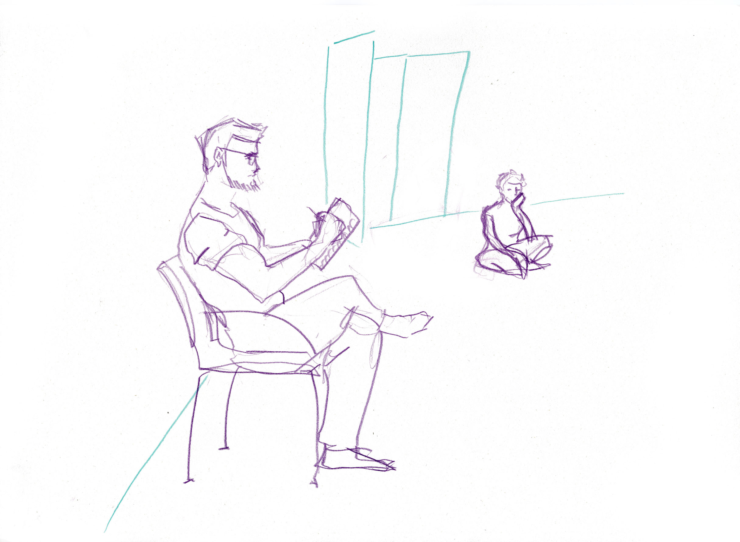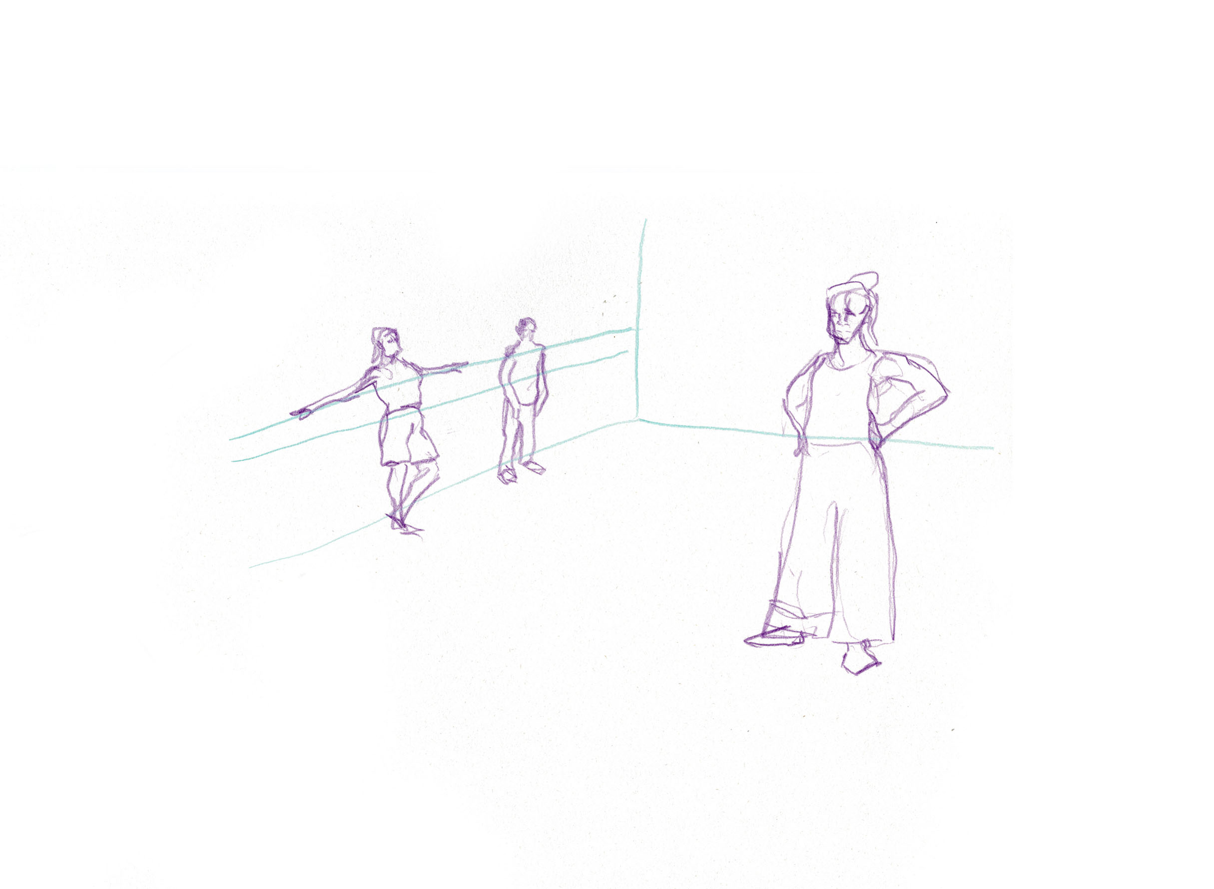 Dieses Reportagezeichnungsprojekt ist aus einer Kollaboration mit der Tanzklasse von Jakub Truszkowski am Folkwang Campus in Essen-Werden entstanden. Ich habe die Klasse regelmäßig zeichnerisch bei den Proben für einen Auftritt begleitet. Woche für Woche habe ich dabei Entwicklungen in der Choreografie und Situationen zwischen den Studierenden beobachten und festhalten können. Alle Zeichnungen sind während der Proben entstanden.