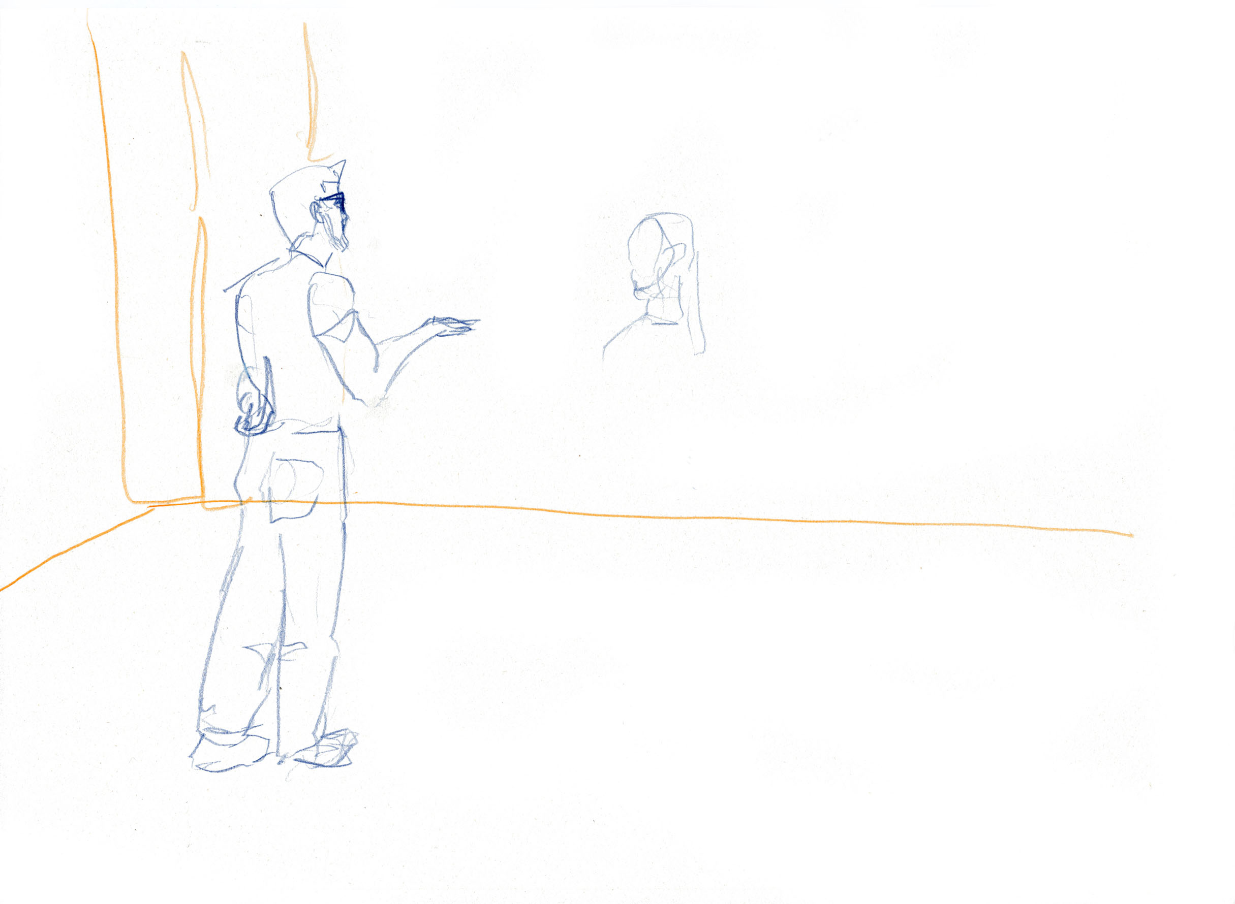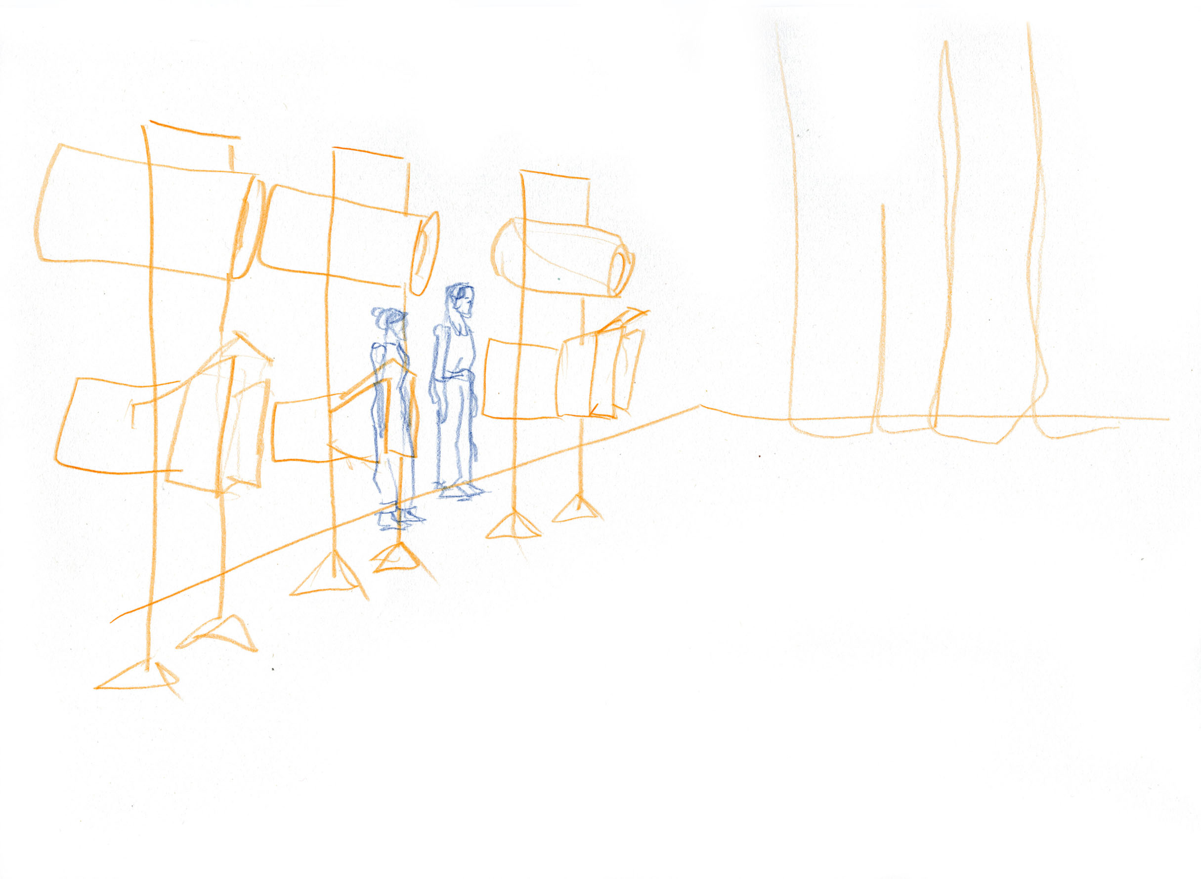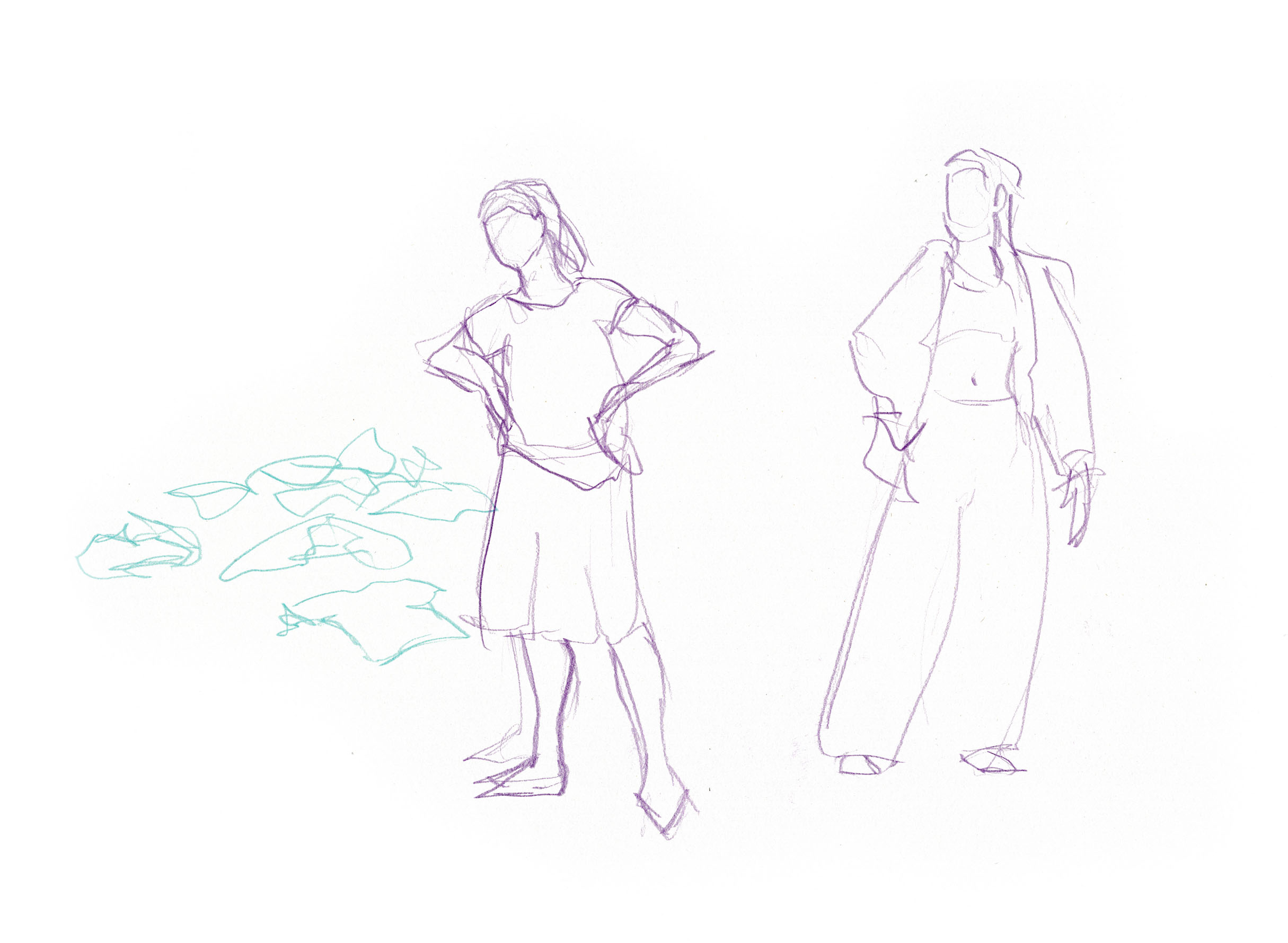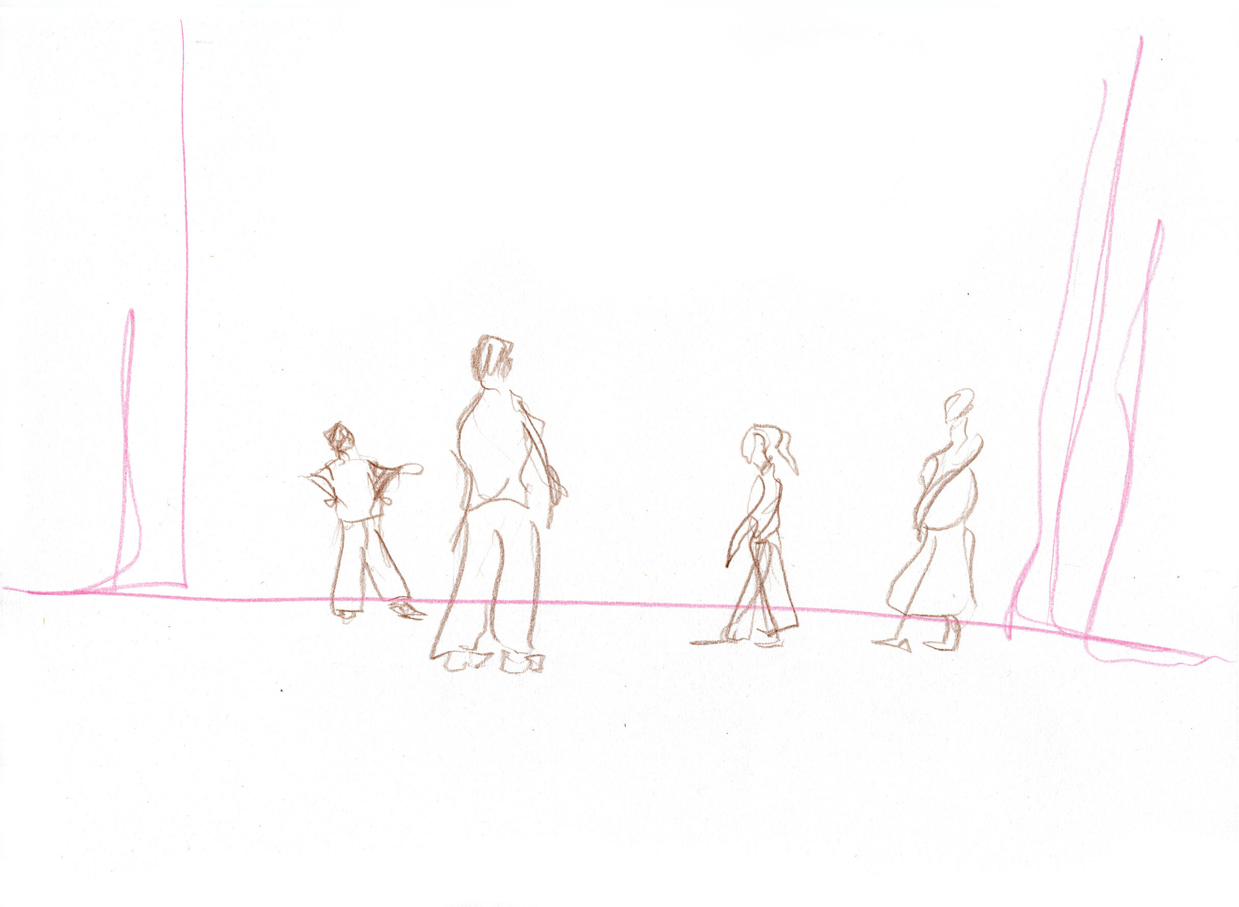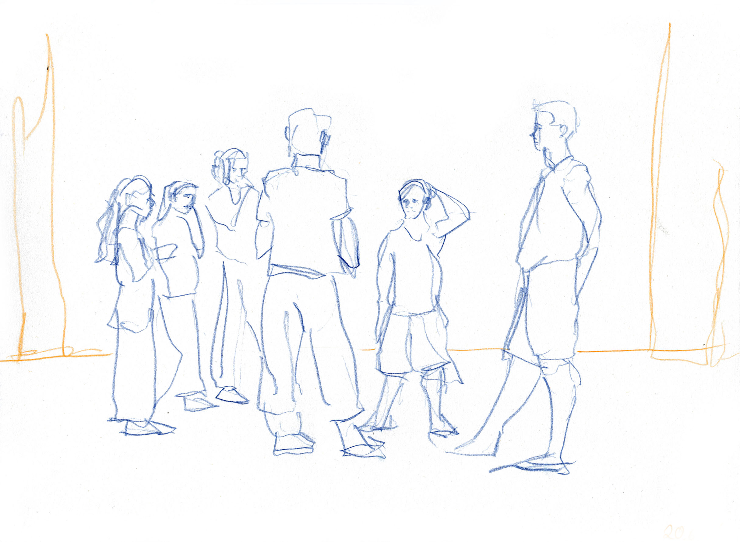 This documentary drawing project is the result of a collaboration with Jakub Truszkowski's dance class at the Folkwang Campus in Essen-Werden. I regularly accompanied the class with drawings during rehearsals for a performance. Week after week I was able to observe and capture developments in the choreography and situations between the students. All drawings were made during the rehearsals.